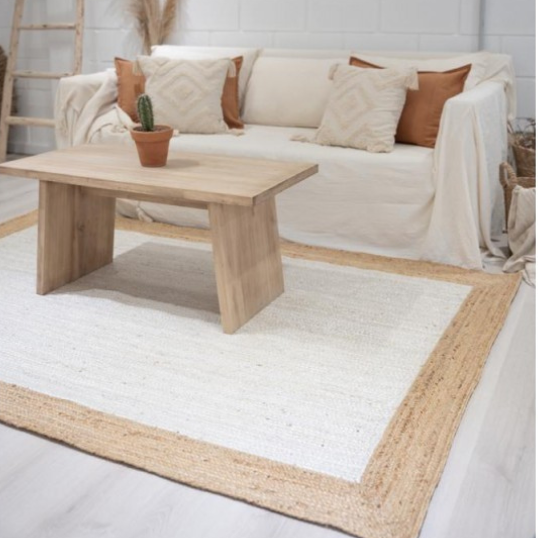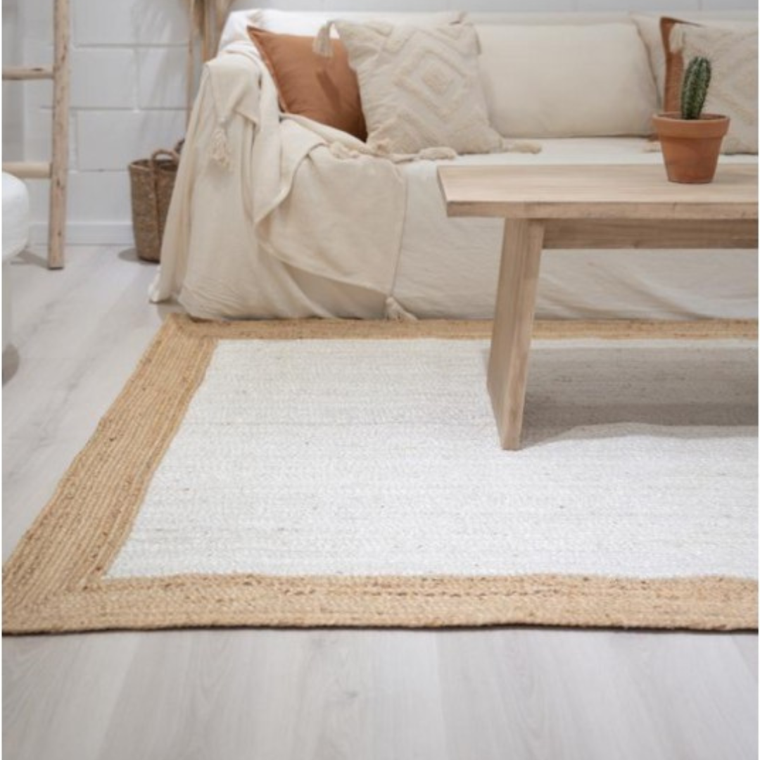 Nuestra alfombra NEW GUNA es la pieza ideal para dar un toque natural y luminoso a cualquier espacio. Hecha con 100% yute importado de India, esta alfombra tiene un diseño único con el cuerpo en color blanco y un elegante borde natural. Su trenzado a máquina asegura una textura uniforme y duradera, perfecta para complementar tu decoración con un estilo fresco y artesanal.