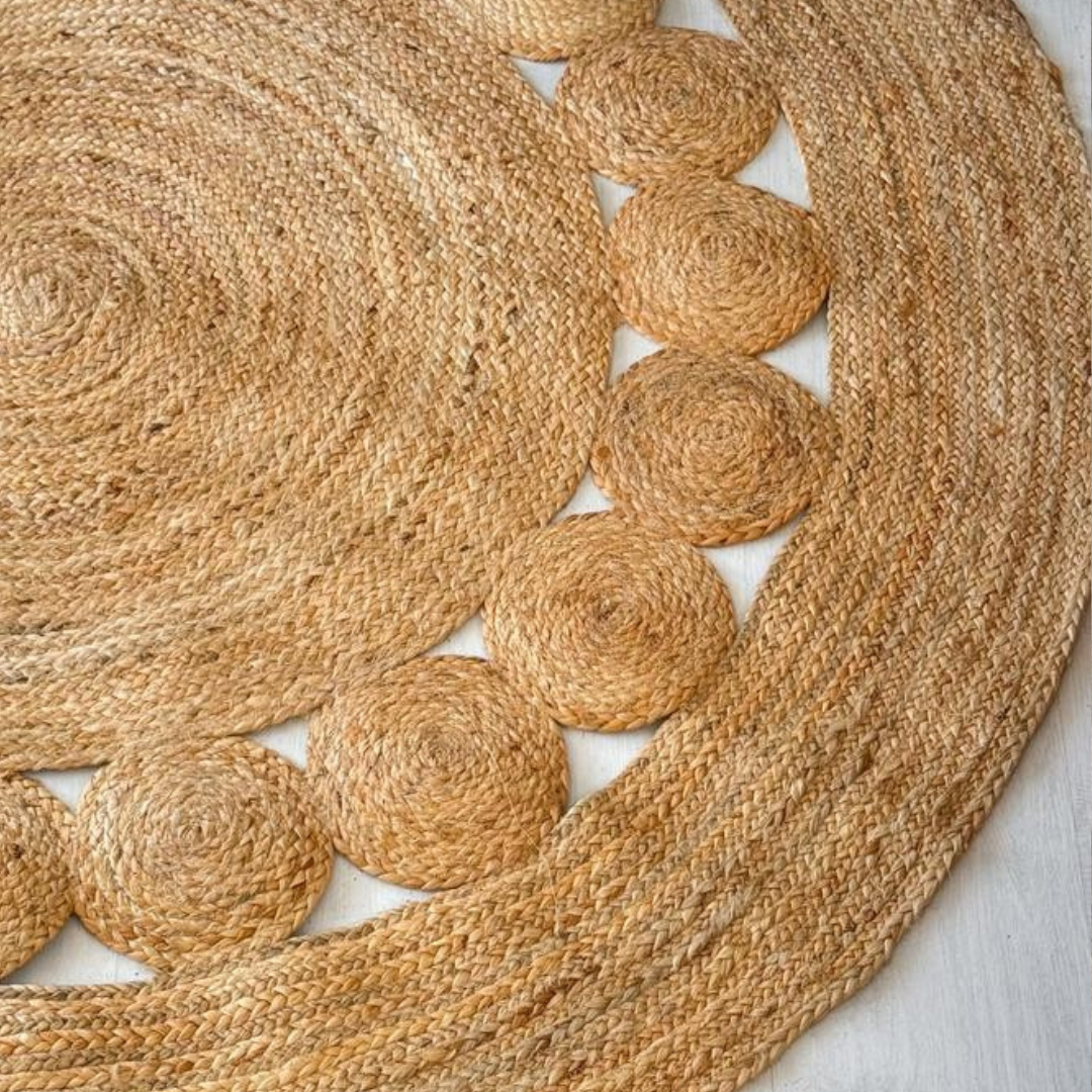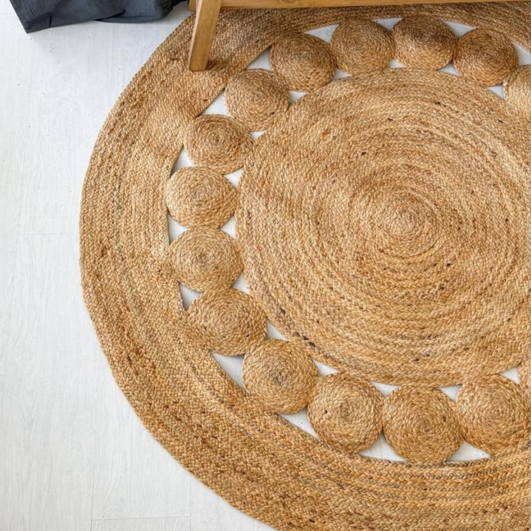 Confeccionada en yute trenzado, esta alfombra redonda con formato de flor y diseño calado es ideal para sumar un toque natural y artesanal a tus espacios.