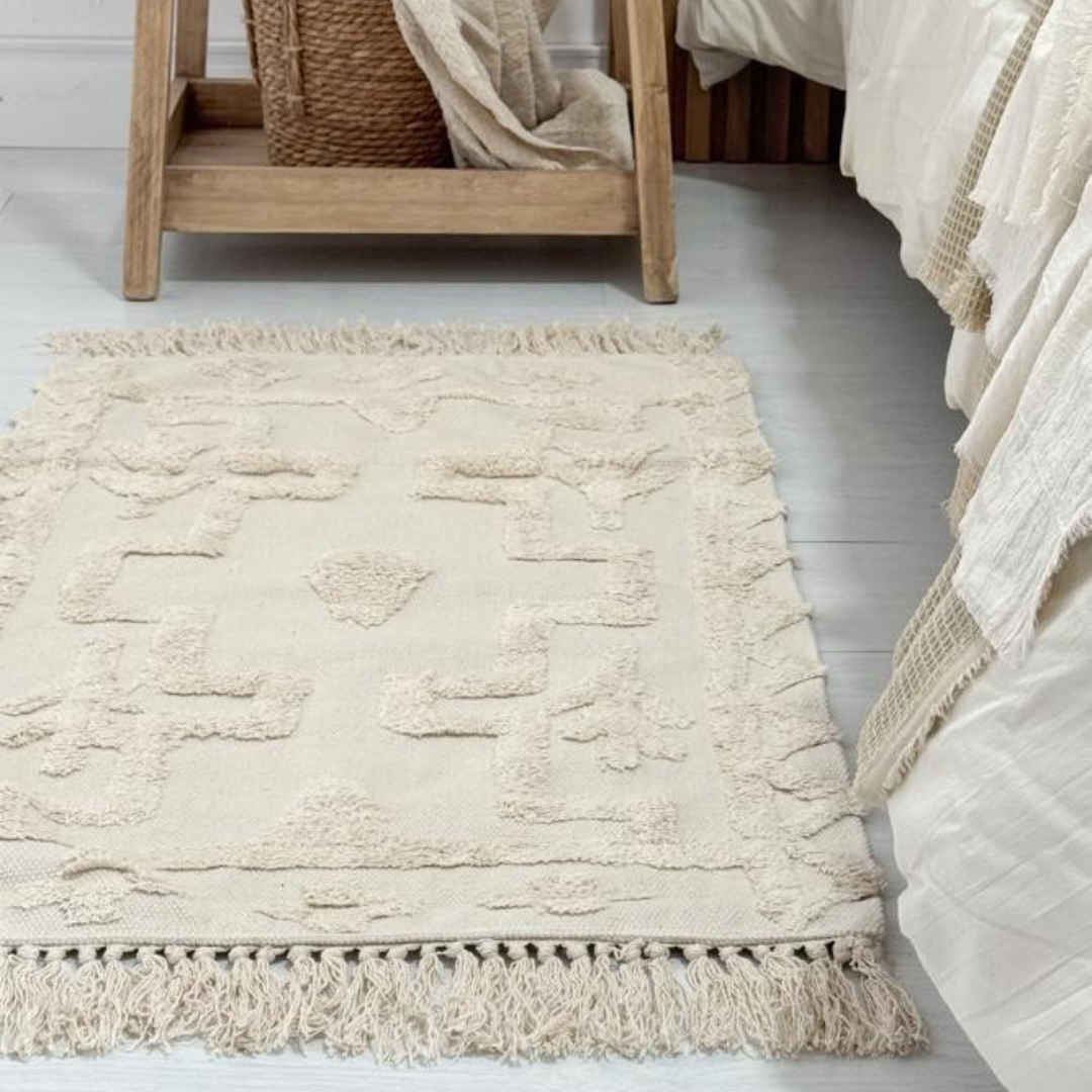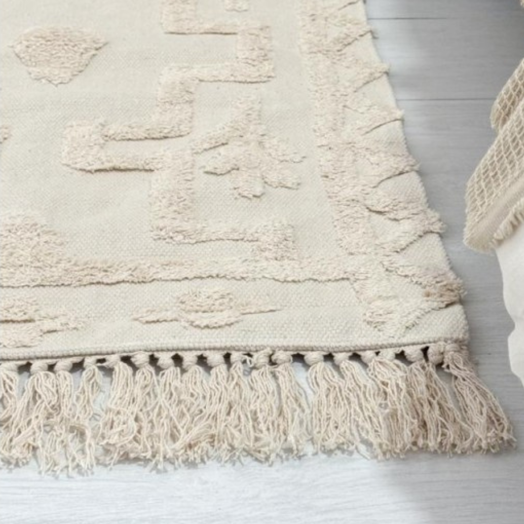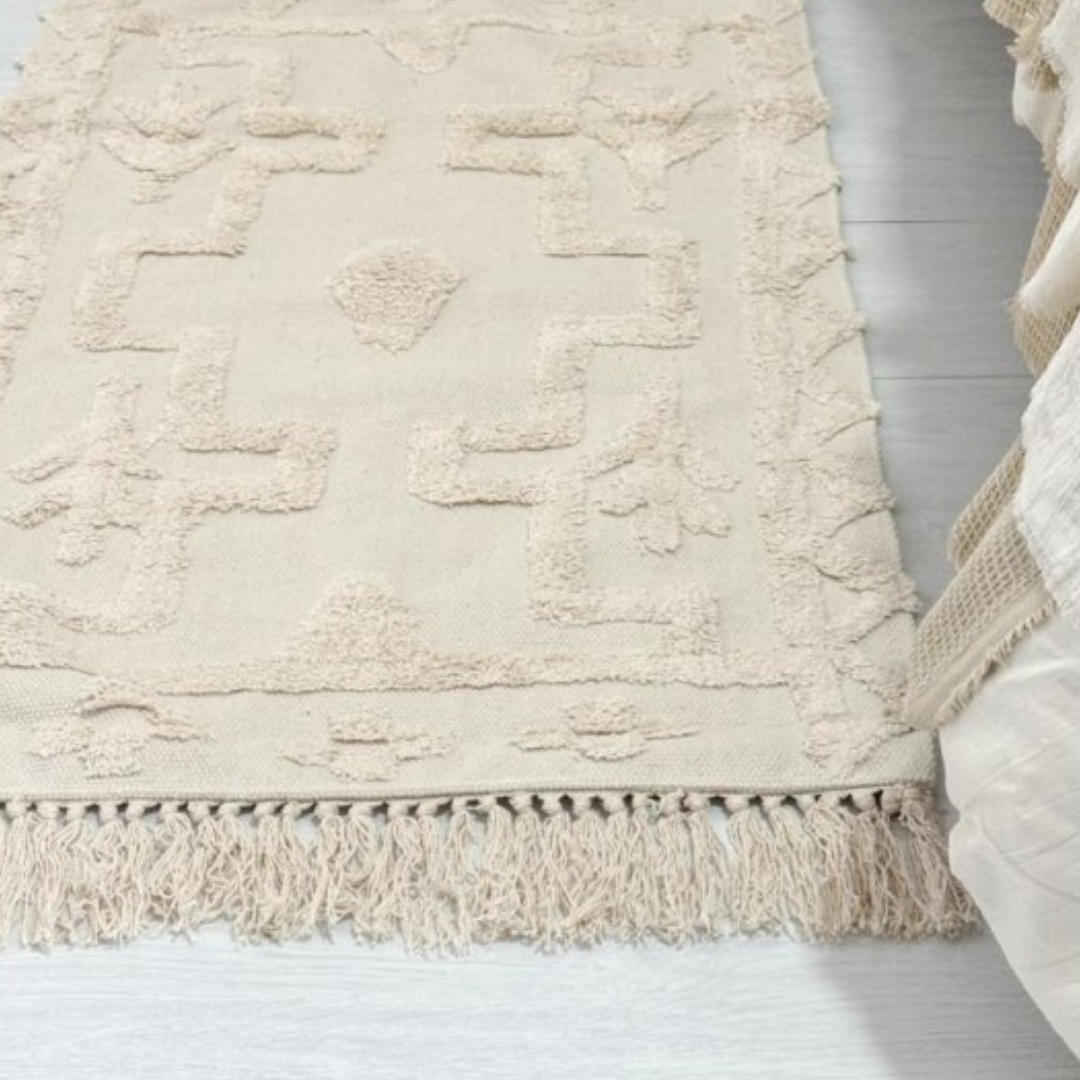 Nuestro costado de cama TARAL es el complemento perfecto para darle un toque cálido y acogedor a tu dormitorio. Importado de India, está hecho con 100% algodón tejido en telar, lo que le da una textura suave y artesanal. Su color crudo lo hace ideal para combinar con cualquier estilo de decoración, creando un espacio lleno de confort.