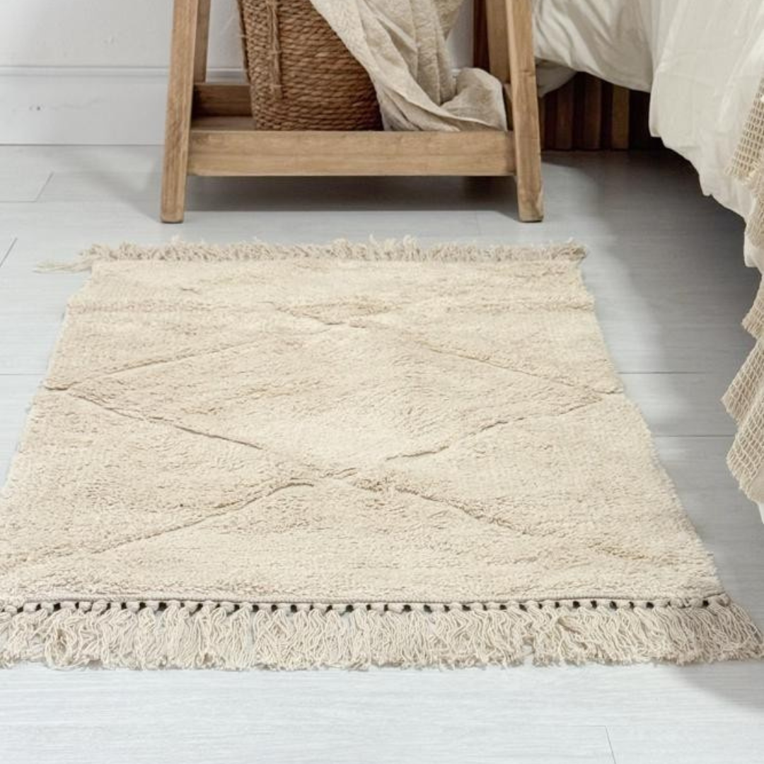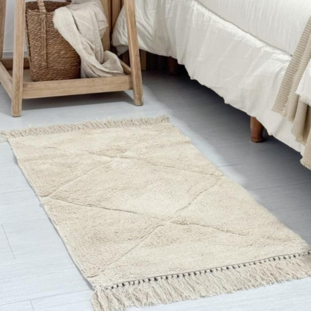 Nuestro costado de cama TASNIN es la pieza perfecta para sumar calidez y confort junto a tu cama. Hecho con 100% algodón importado de India, es suave al tacto y ideal para darle un toque acogedor a tu dormitorio. Su practicidad es inigualable, ya que es lavable en lavarropas, lo que facilita su mantenimiento y limpieza.