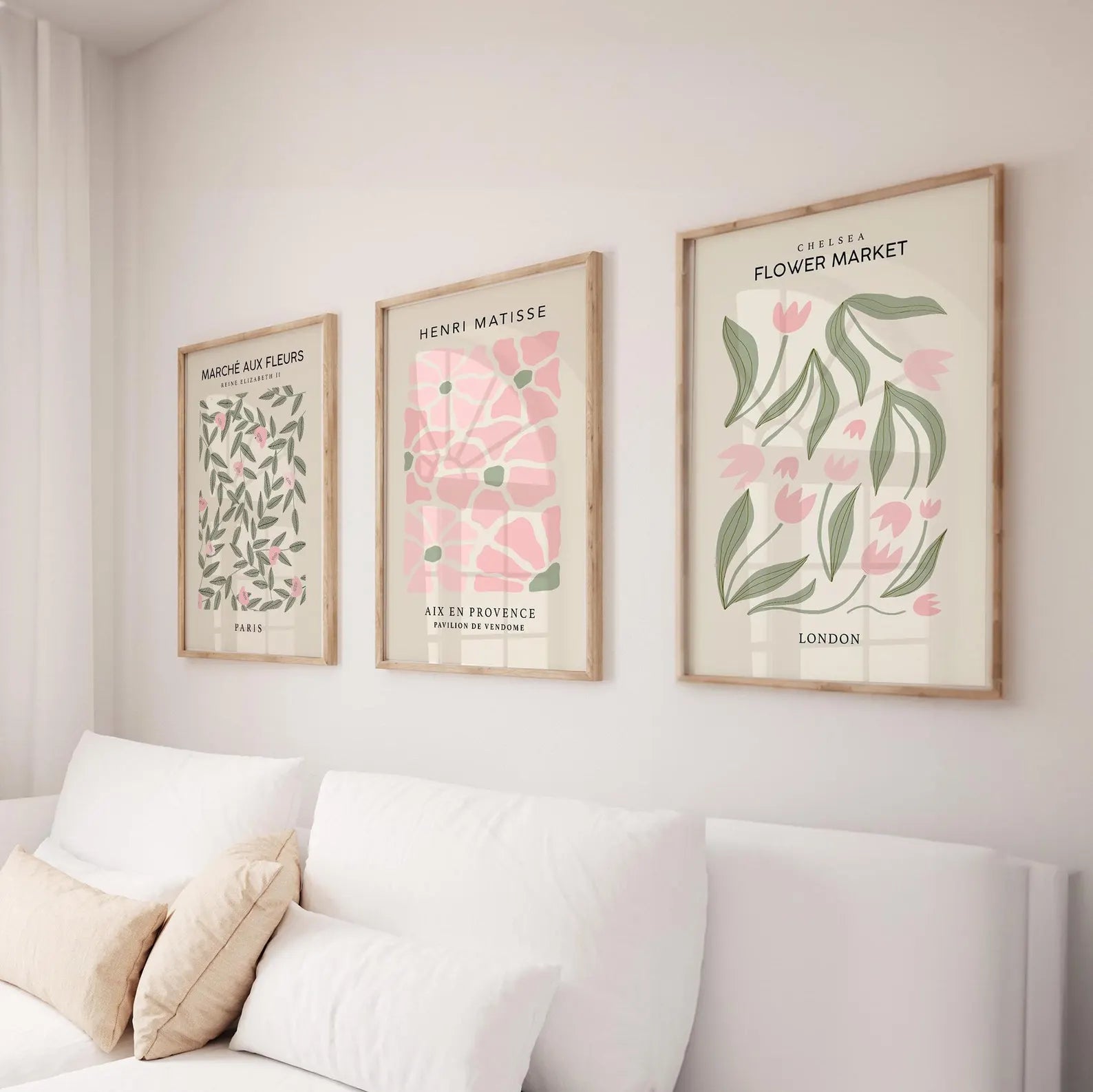 Set x3 Cuadros Decorativos Botánicos Hojas Verdes Flores Rosas Con Fondo Blanco