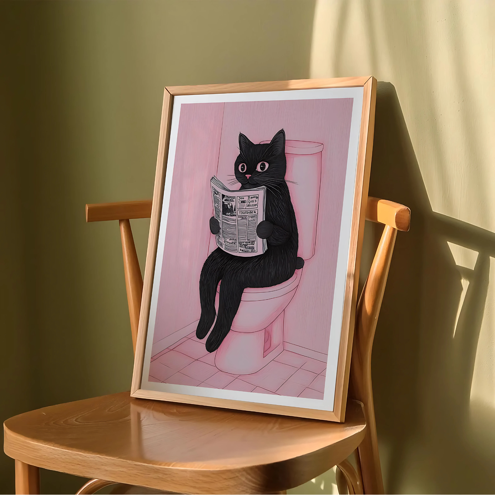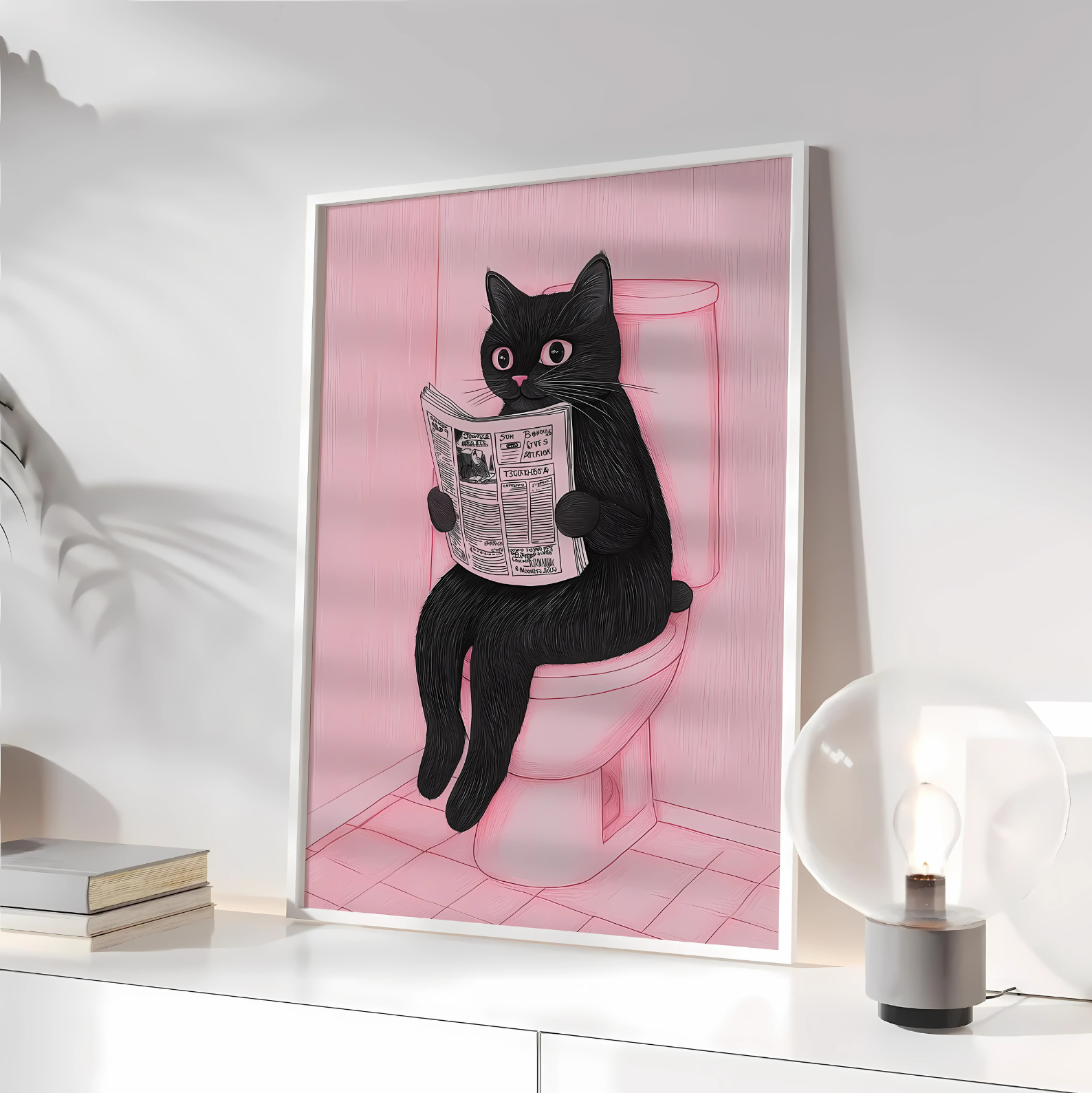 Cuadro Decorativo Gato Negro Sentado En Baño Rosa Leyendo Un Diario