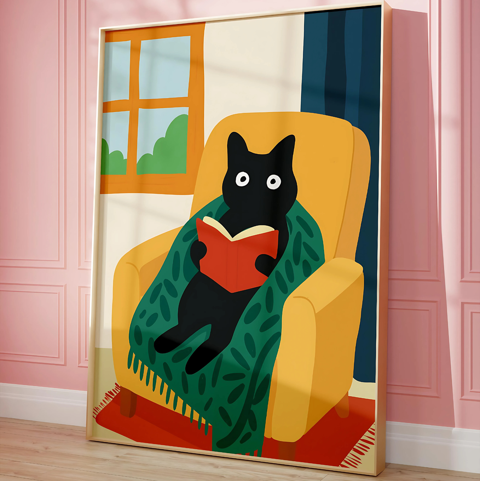 Cuadro Decorativo Gato Negro Tapado Leyendo Sillón Amarillo