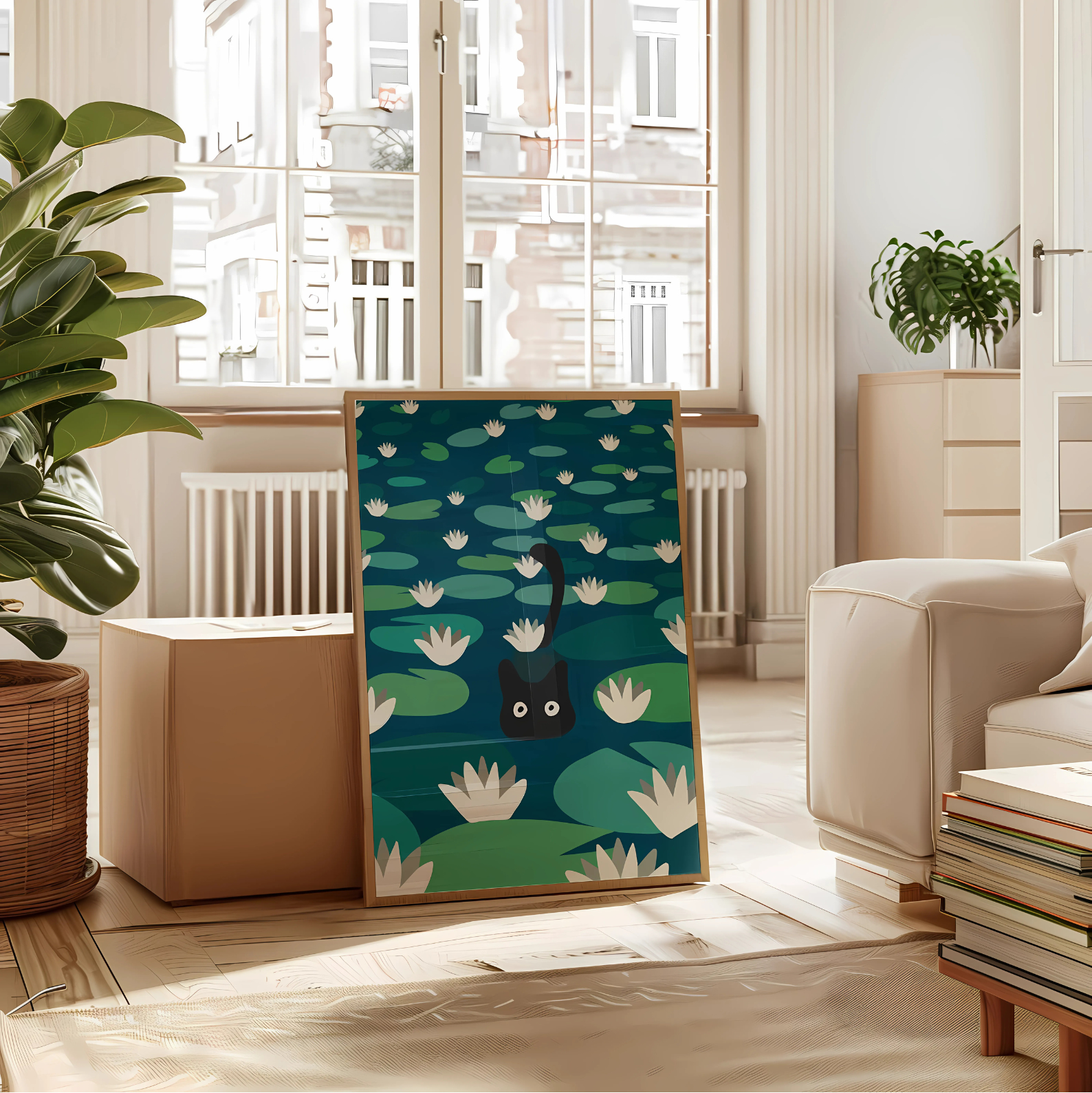 Cuadro Decorativo Gato Negro Nadando En Lago