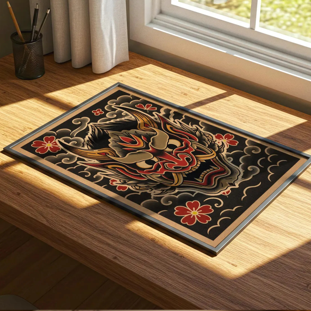 Cuadro Decorativo Tatuaje de máscara de oni, arte mural de demonio japonés