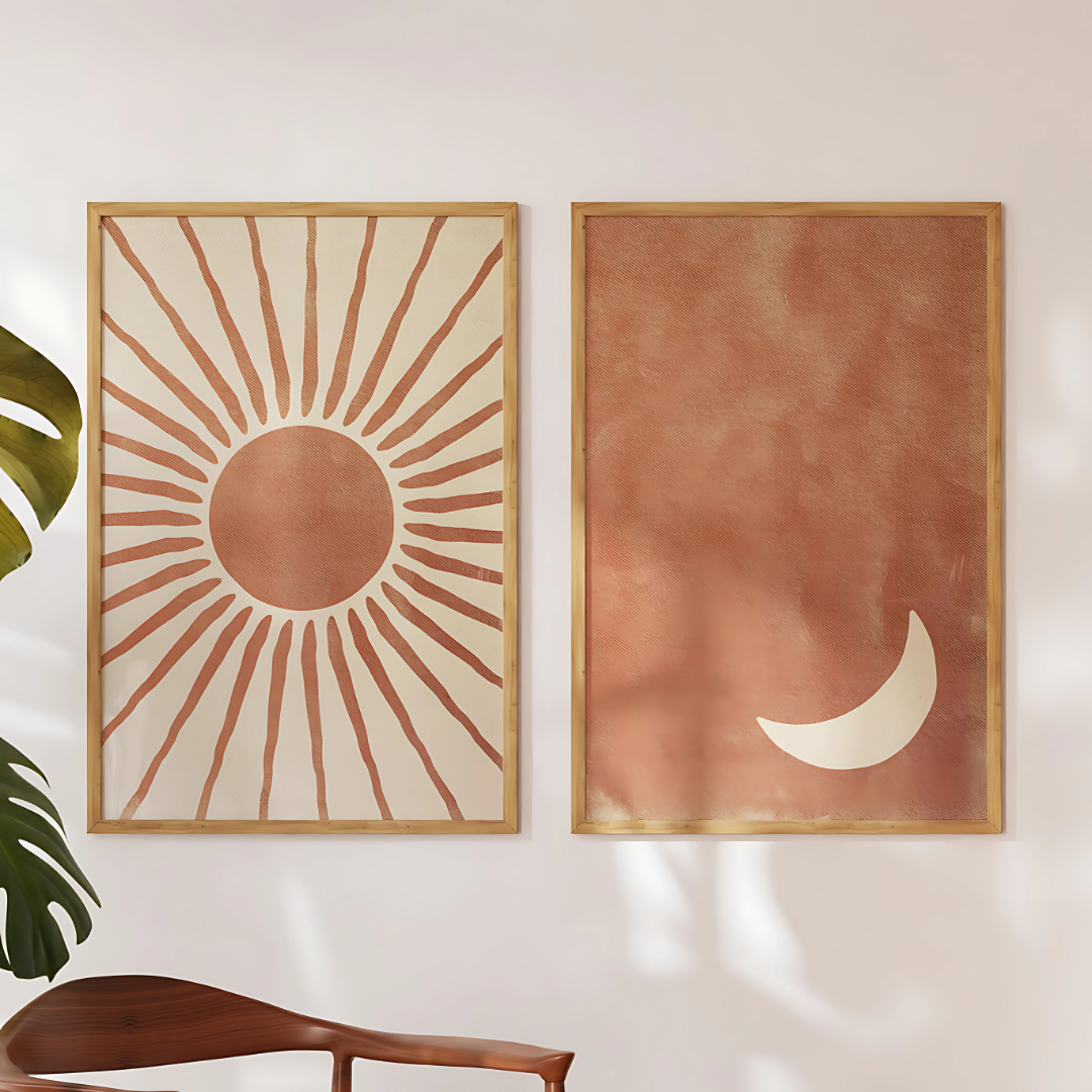 Set x2 Cuadros Decorativos Abstracto Sol Y Luna, Rojo y Blanco