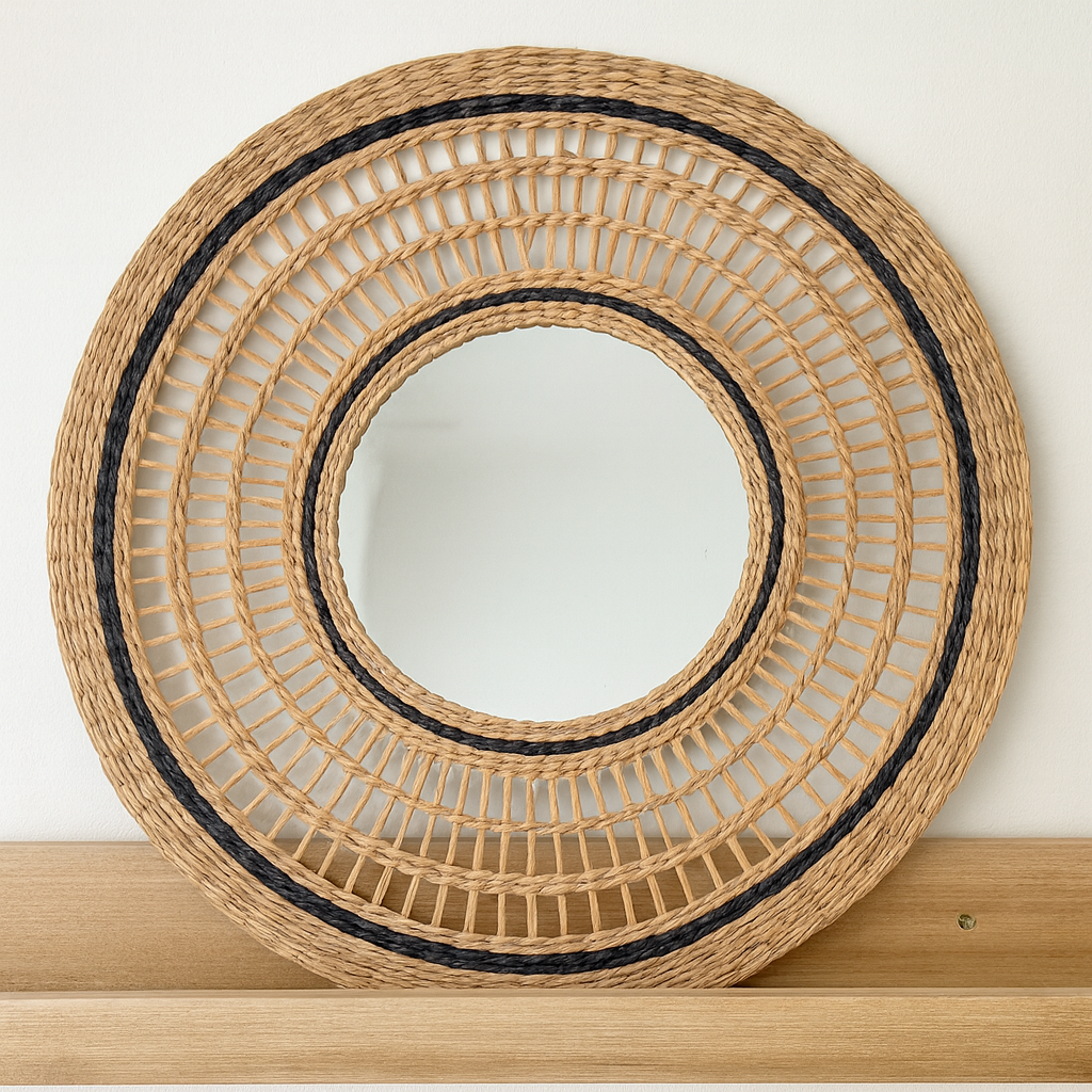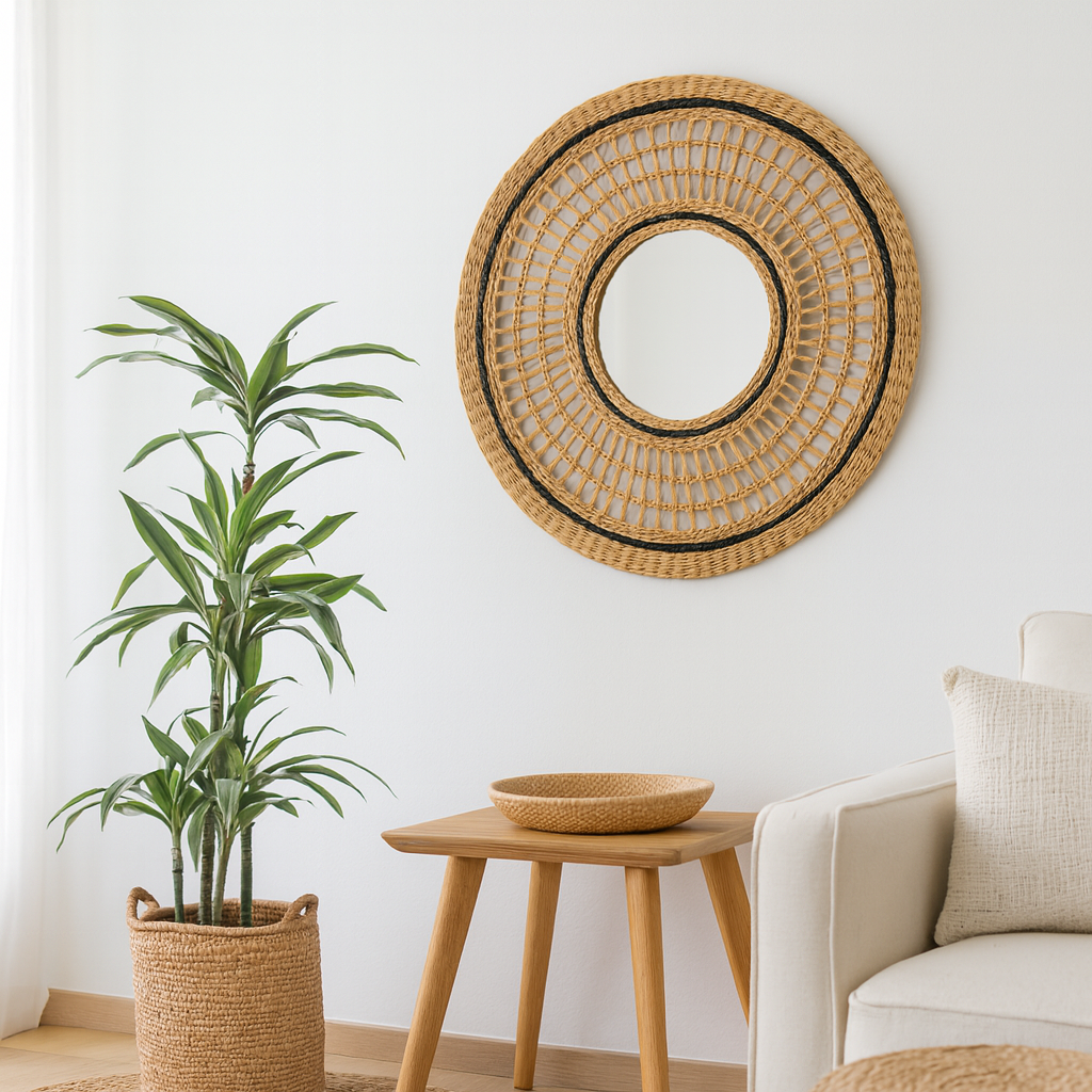 Nuestro espejo TURONG es la pieza ideal para quienes buscan un toque de estilo artesanal y natural para sus ambientes. Hecho con 100% fibra natural importada de India, su diseño único y orgánico le da un toque de frescura y calidez a cualquier pared. Está disponible en dos medidas y dos colores, para que puedas elegir el que mejor se adapte a tu decoración.