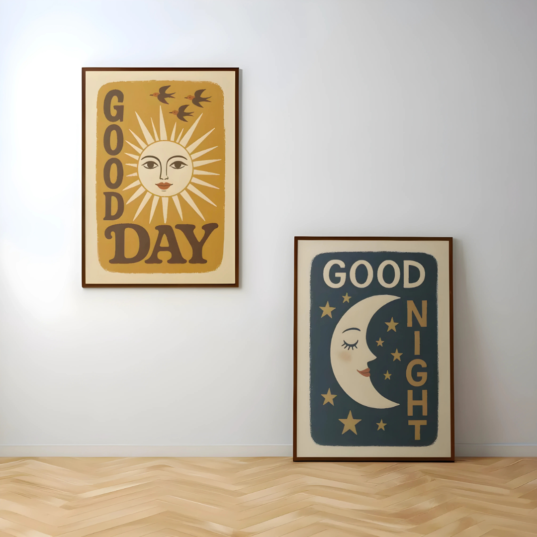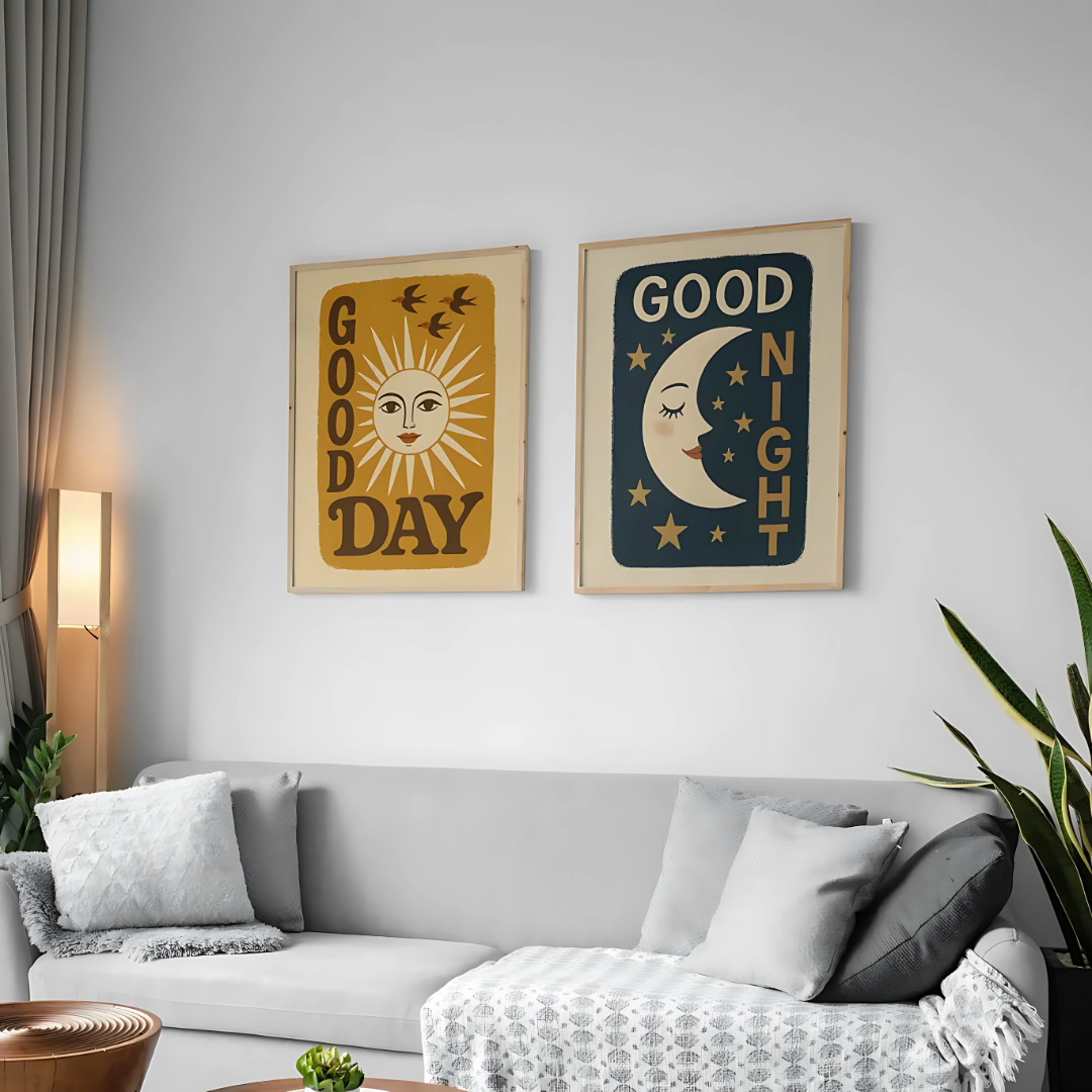Set x 2 Cuadros abstractos Sol Y Luna Good Day Good Night