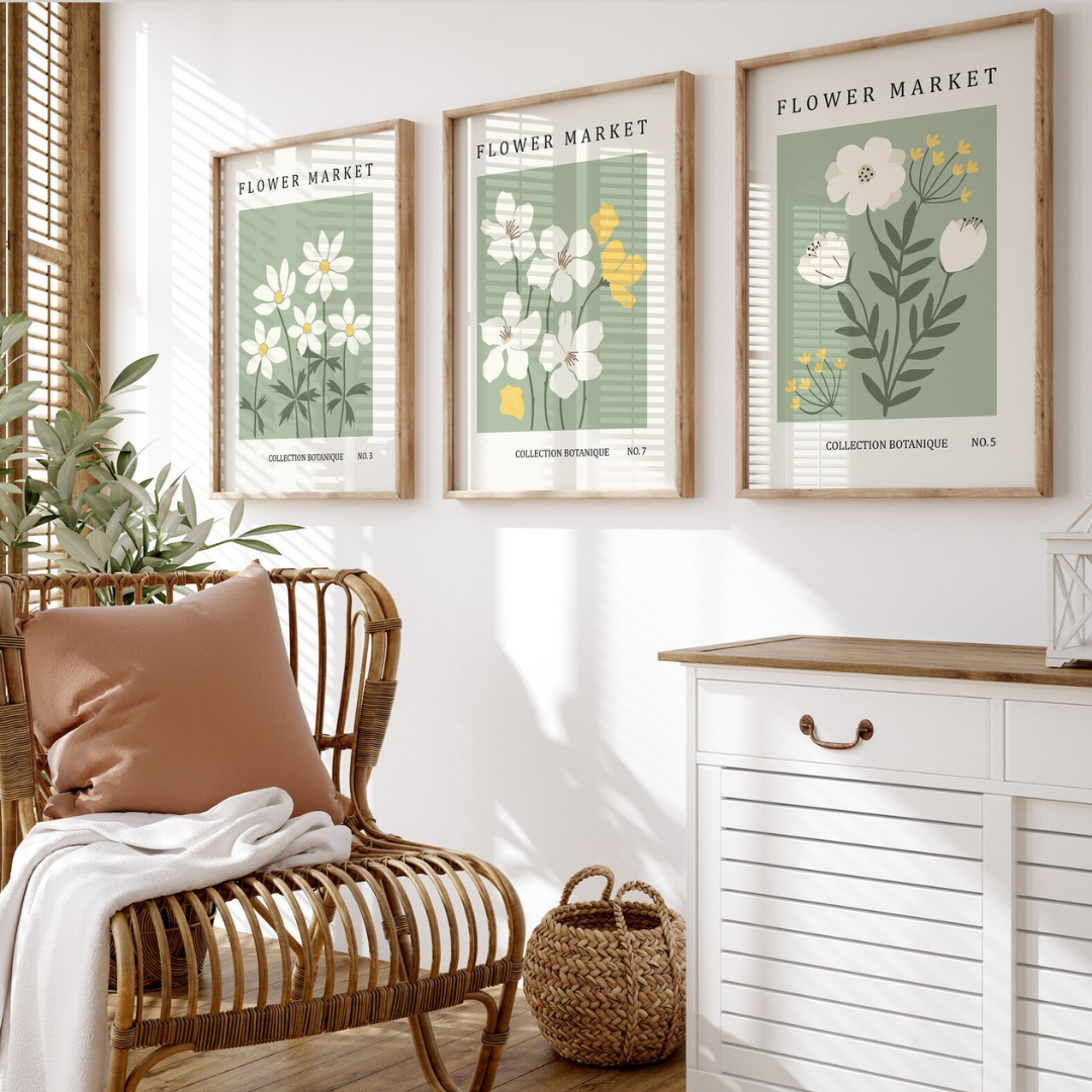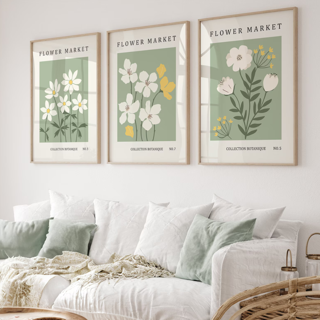 Set x3 Cuadros Abstractos, Flower Market, Colores Verdes