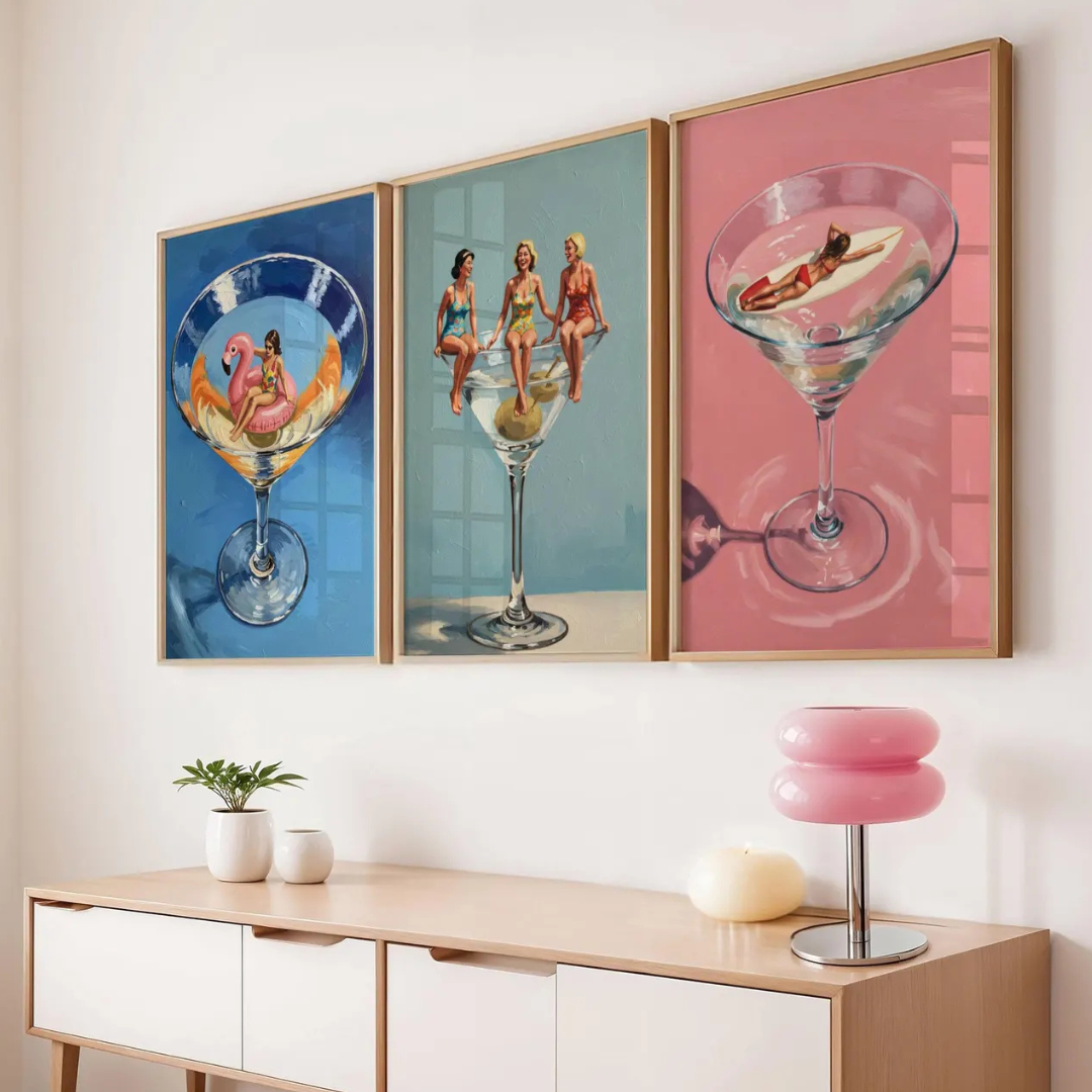 Set x3 Cuadros Cócteles originales, arte mural de mediados de siglo