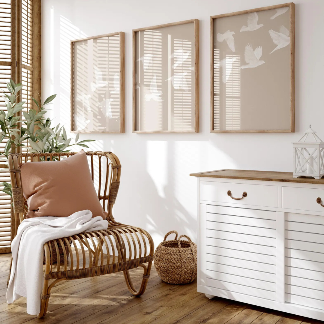 Set x3 Cuadros beige neutros, pájaros en vuelo