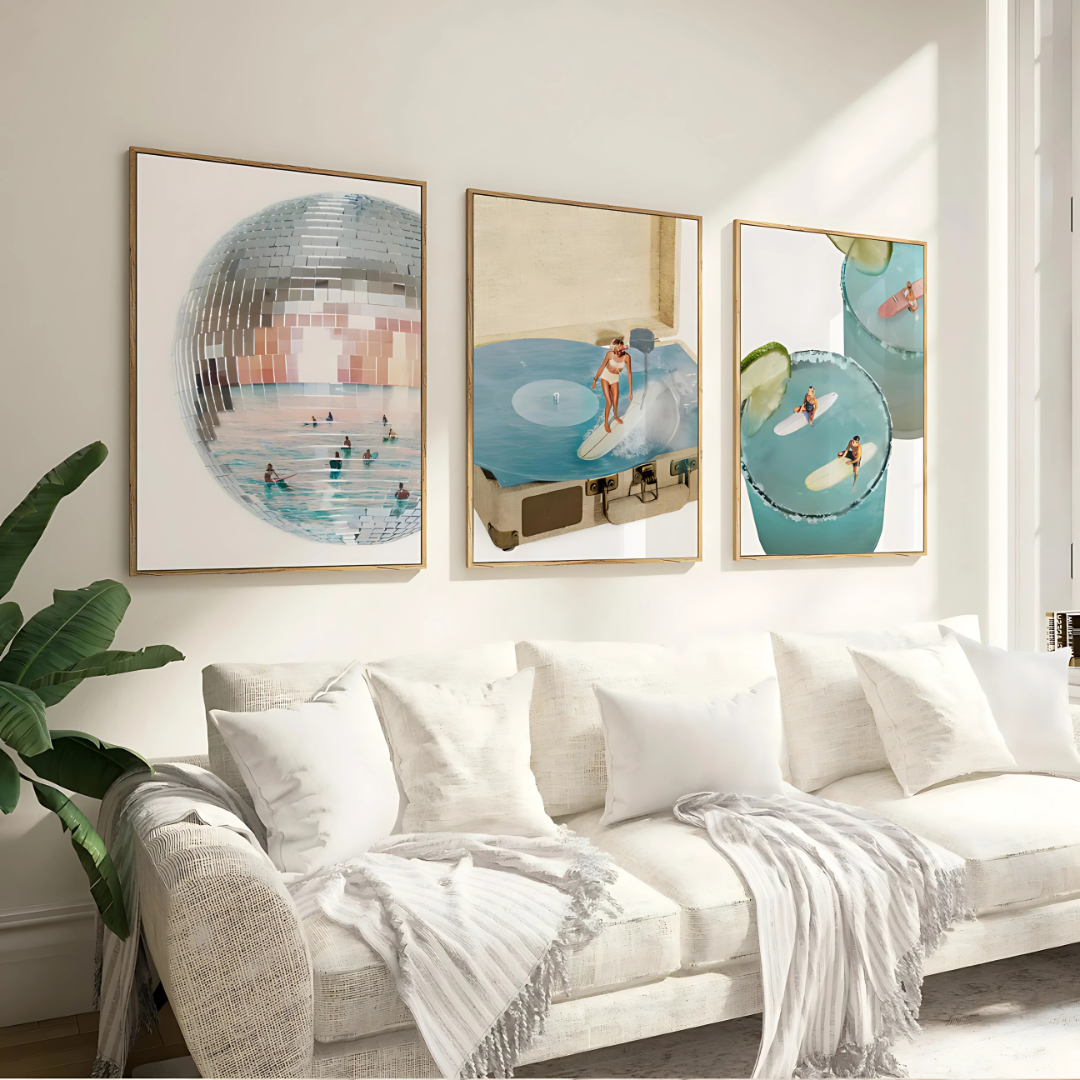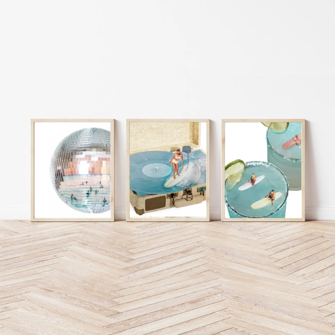 Set x3 Cuadros disco, playa, surf, retro, verano, moda, estética costera, playa, collage funky